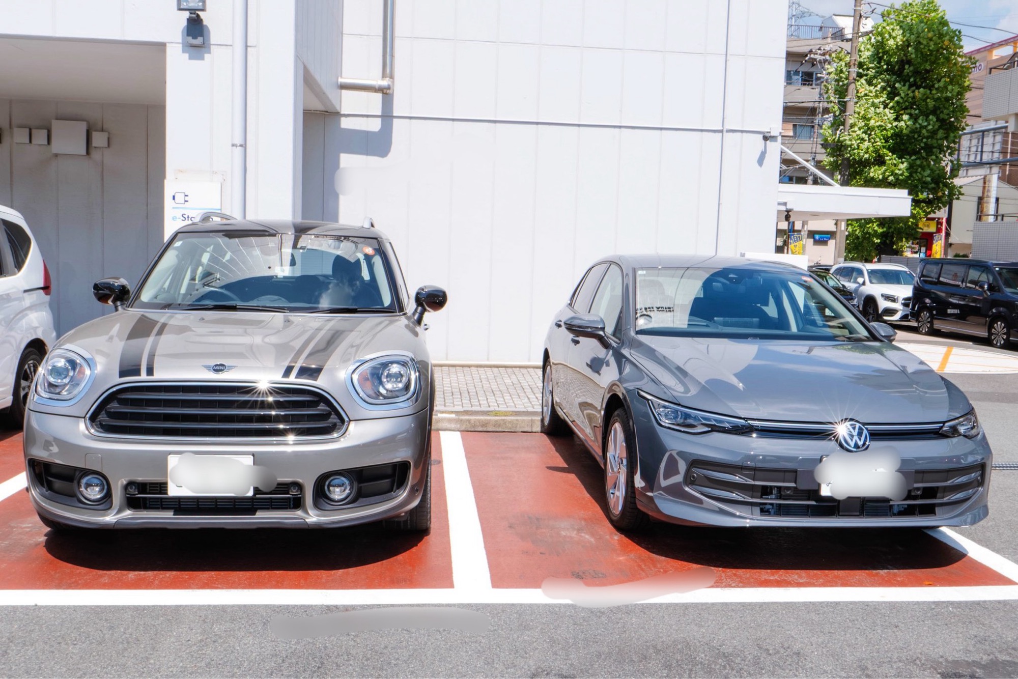 これまでの愛車MINIちゃんと新しくお迎えするゴルフちゃんの2ショット。MINIは大好きな車だったので、ちょっとほろっとします。たくさんの思い出をありがとう♪