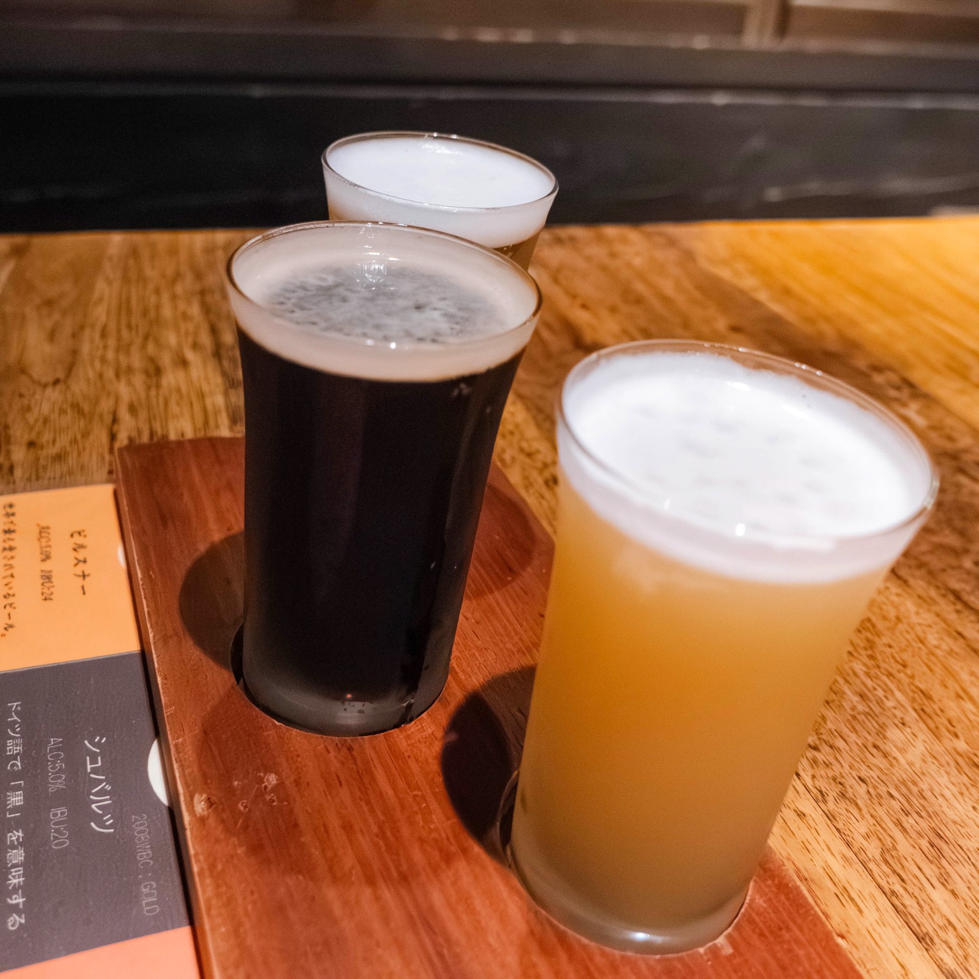 飲み物は私はビールの飲み比べセットを注文。季節のビール(一番手前)は桃のビールでとても美味しかったです♪