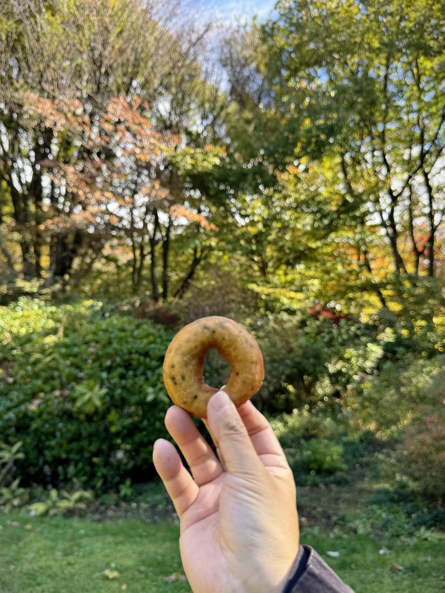 池のところにあったベンチに座って、先ほどお豆腐屋さんで買ったおからごまドーナツを食べて一休み。素朴なお味で美味しかったです♪