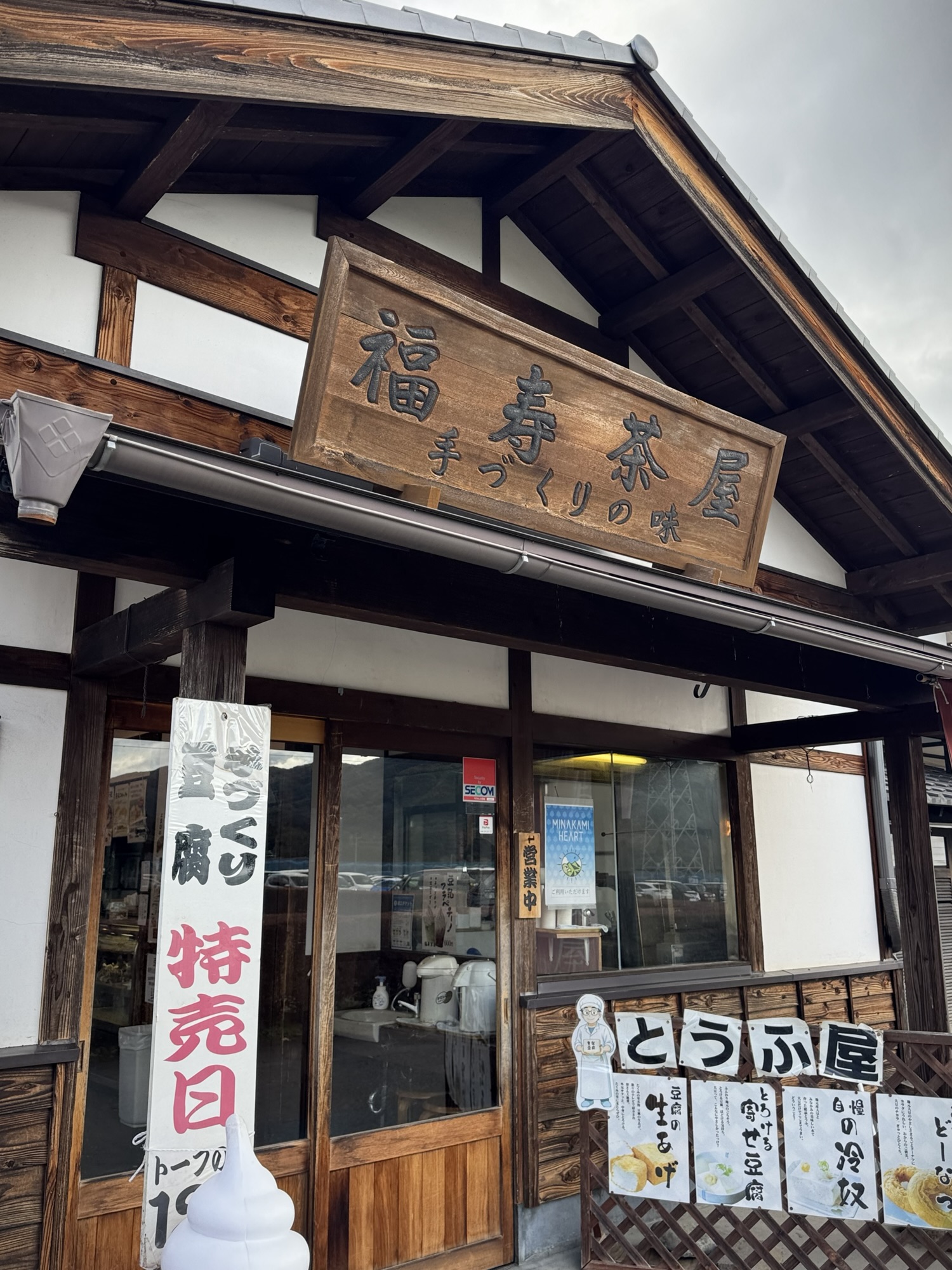 豆腐や野菜買い出しのため、道の駅たくみの里を再訪します。まずは昨日の夕食に頂いた湯豆腐が美味しくて、絶対買って帰りたい!ってなったお豆腐屋さん(福寿茶屋さん)へ。