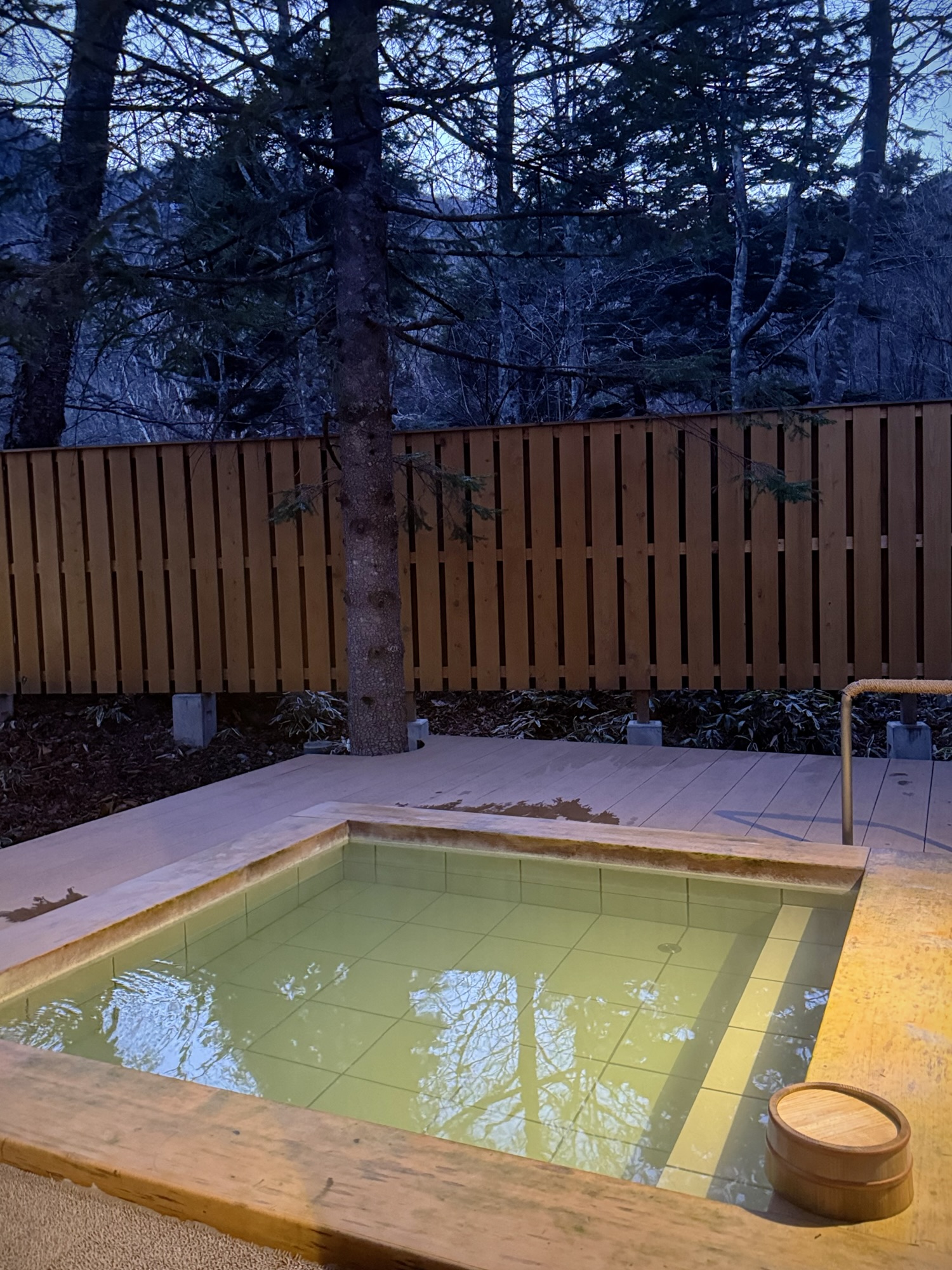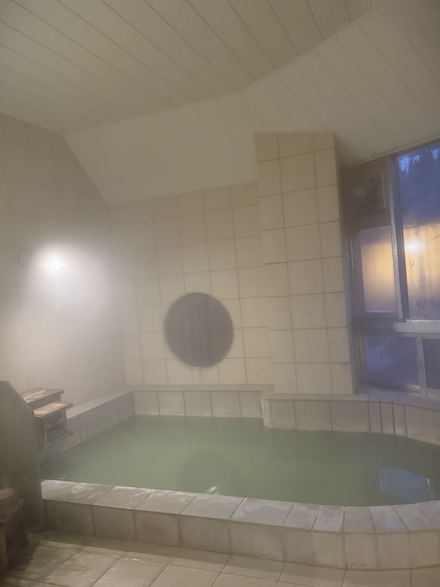 ここのお宿は、翌日の朝まで大浴場が貸切できるので、オットと2人で貸切風呂へ行くことにします。貸切風呂は2つあるのですが、ちょうど1つ空いていたので利用しました。内風呂と露天風呂と2つあって贅沢です^_^