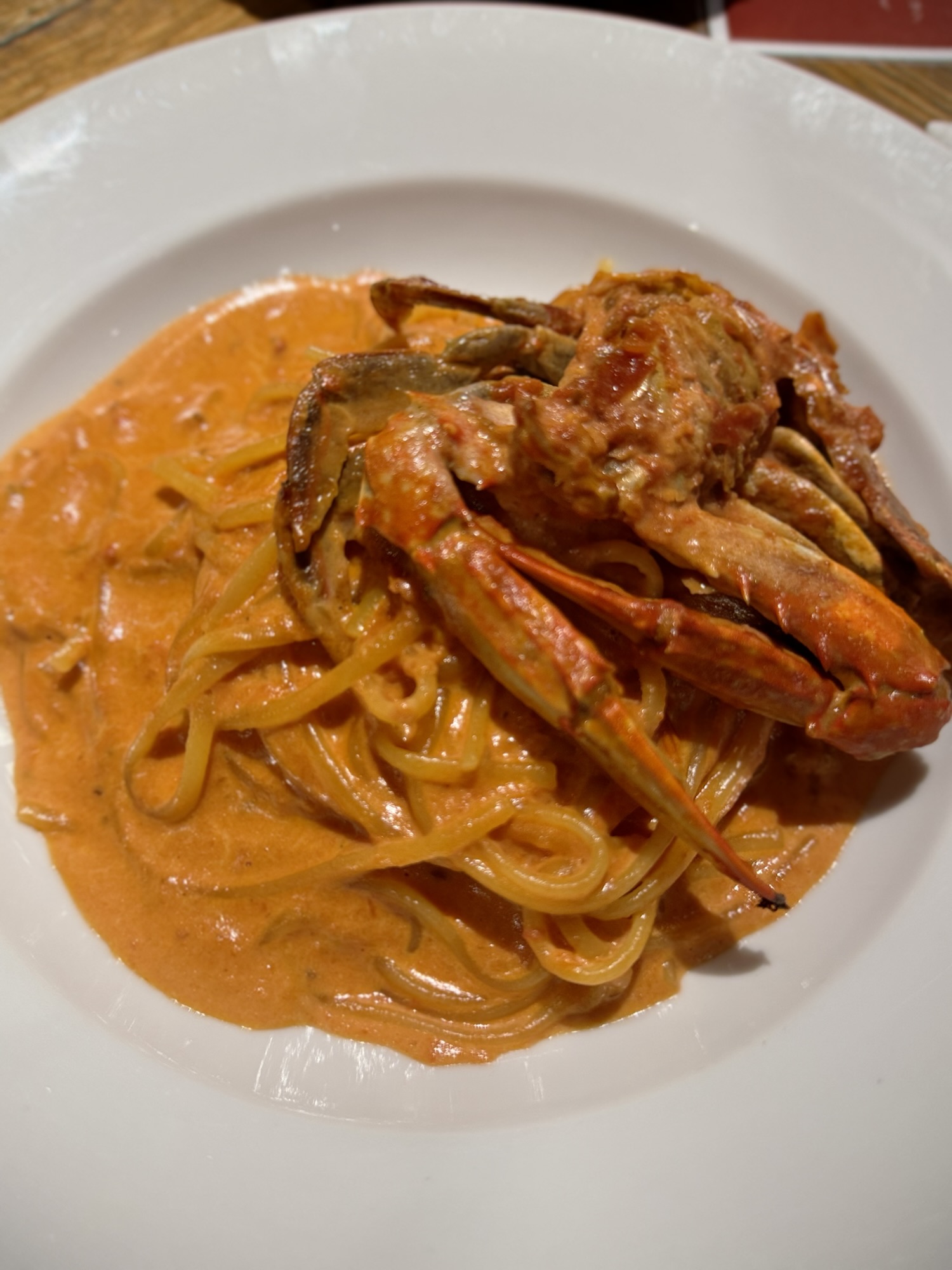 渡り蟹のパスタ。麺がもちもちで美味しかったです♪